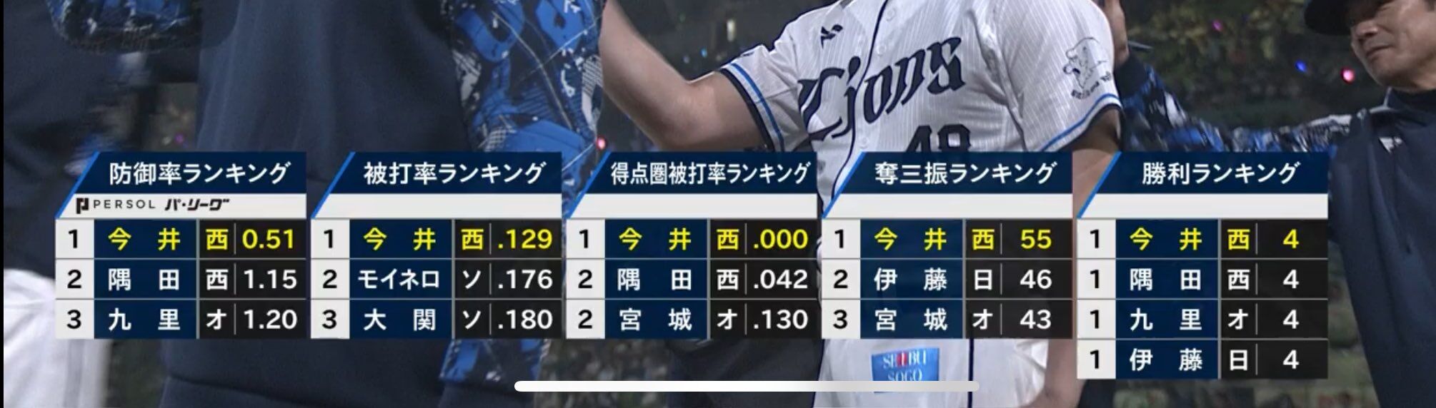 勝利投手 西武 今井 (4勝1敗0S)