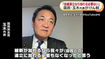 国民民主党の玉木雄一郎代表は15日夜、自身のユーチューブ番組で、日本維新の会の吉村洋文代表と自民党の高市早苗総裁が連立を視野に入れた政策協議を始めることで合意したことに言及し、「つい数時間前まで(維新の)藤田(文武)共同代表と野党の統一候補を目指して真剣に議論していた。二枚舌みたいな感じで扱われて残念だ」とショックをにじませた。また「維新が加わるなら、我々が連立に加わる必要もなくなった」とし、自民と維新による連立政権が成立しても参加しない意向を示した。