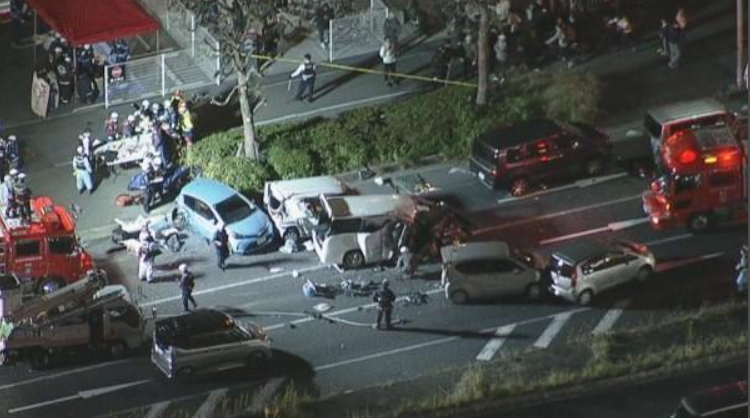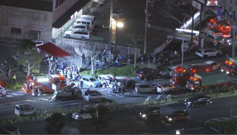 これまでに6歳と4歳の子どもを含む16人がケガをした模様で、このうち70代くらいの男性が車に閉じ込められ、心肺停止の重体だということで、警察と消防が駆けつけ、男性の救出活動を進めています。