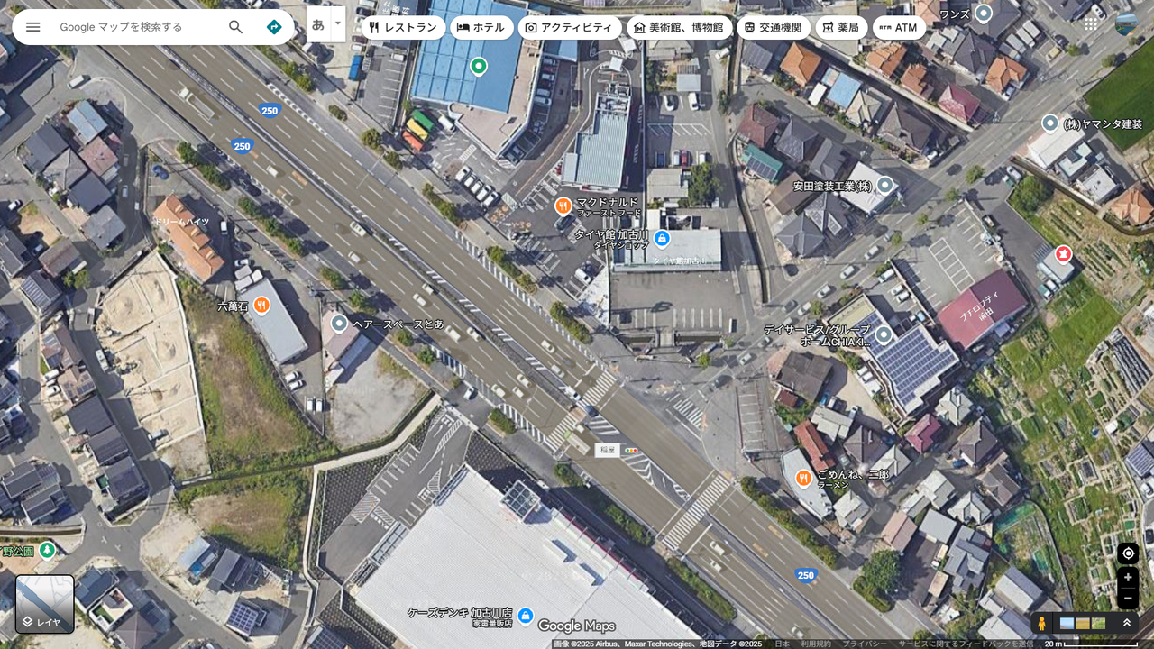 現場はJR加古川駅から西に約2.3キロ離れた国道250号線の交差点付近です。
