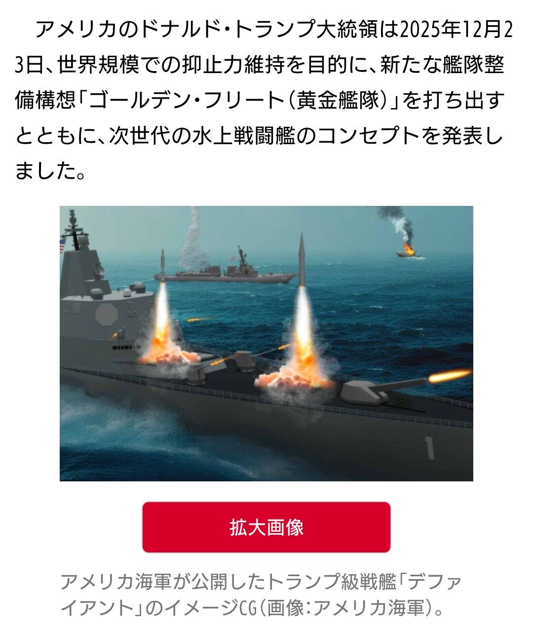 トランプ氏は米艦隊について「中には老朽化して疲弊し、時代遅れになったものもあるが、われわれは正反対の方向に進む」と述べた上で、「米海軍は私とともにこれらの艦の設計を主導する。私は非常に美的感覚のある人間だからだ」と語った。