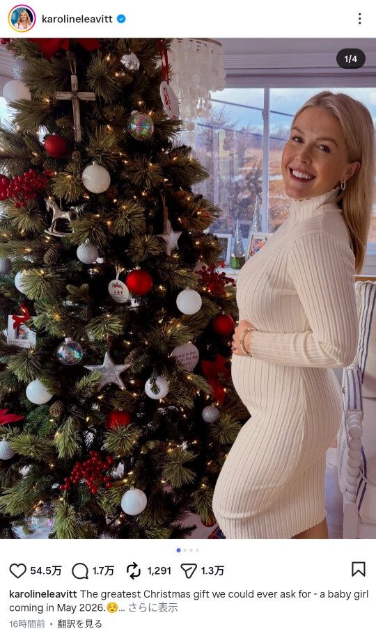 レビット氏はインスタグラムに、「私たちにとって願ってもないクリスマスプレゼント──5月に女の子が生まれる」と投稿。