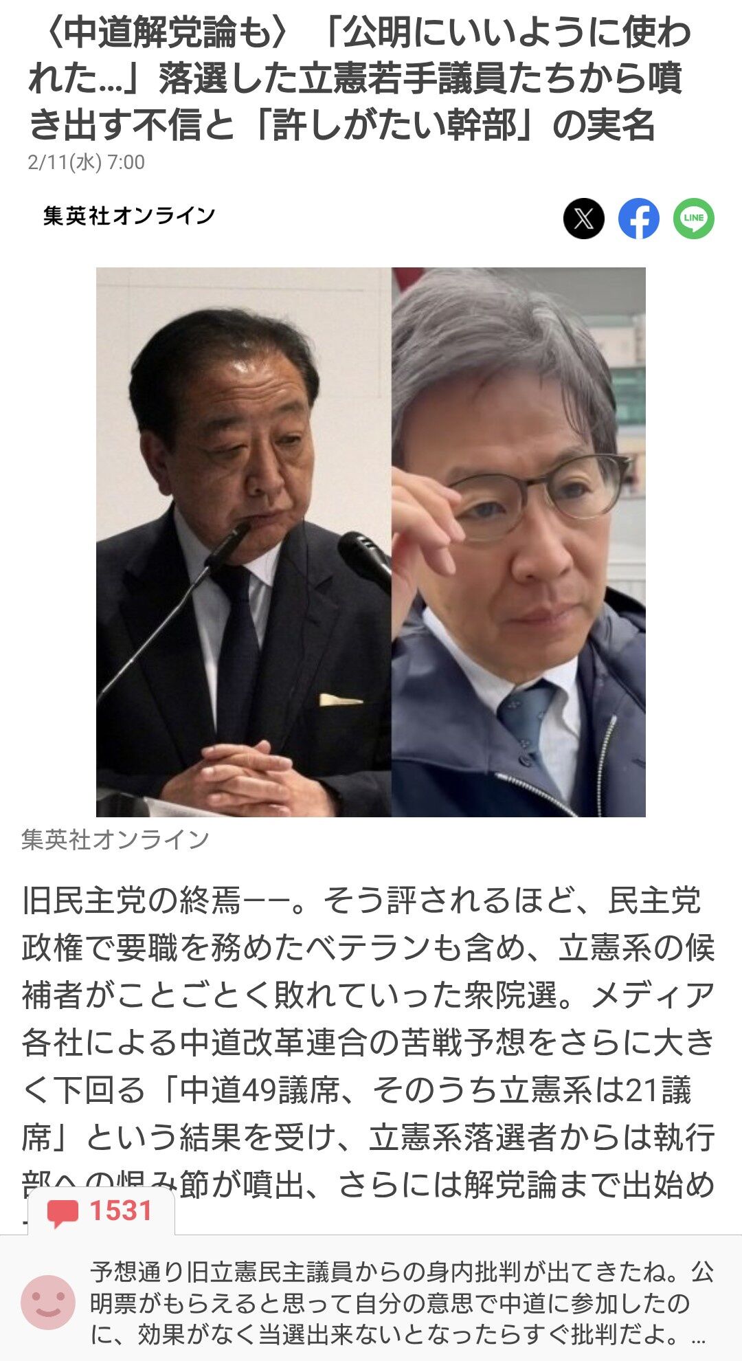 | 〈中道解党論も〉「公明にいいように使われた…」落選した立憲若手議員たちから噴き出す不信と「許しがたい幹部」の実名 …旧民主党の終焉――。そう評されるほど、民主党政権で要職を務めたベテランも含め、立憲系の候補者がことごとく敗れていった衆院選。メディア各社による中道改… (出典:集英社オンライン) |